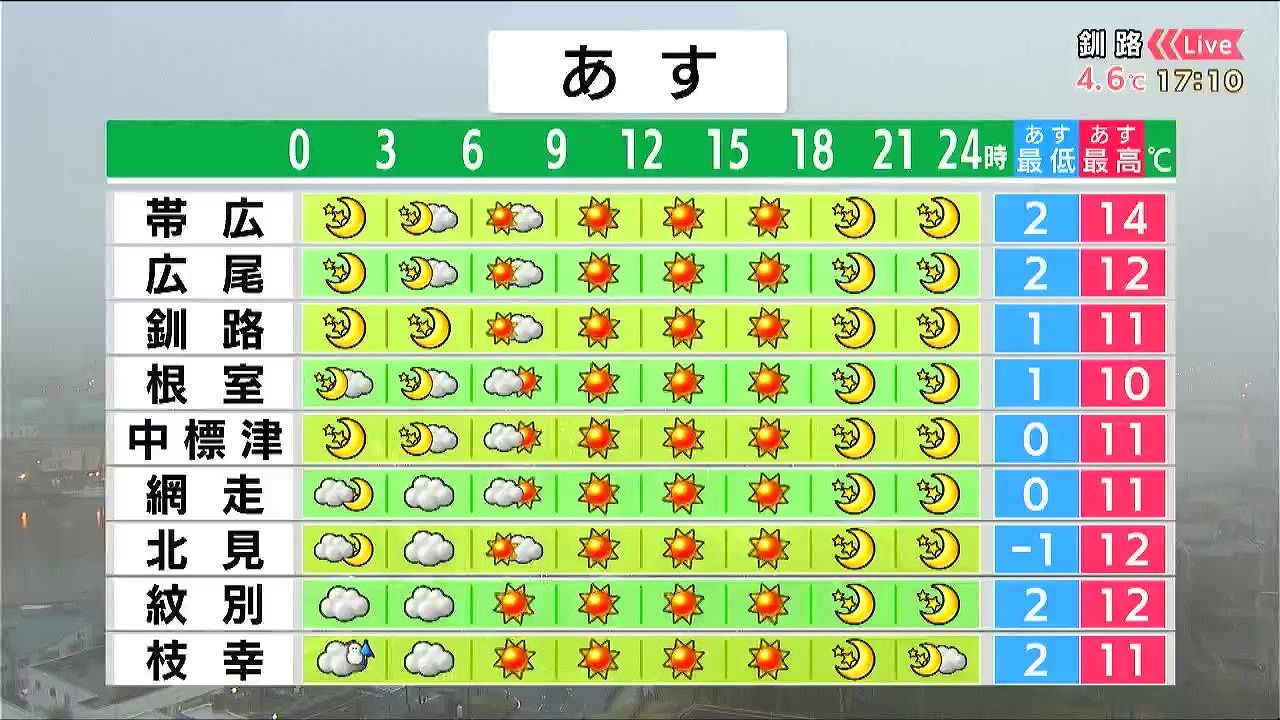 日中は晴れて、帯広や釧路ではきょう7日(火)より大幅に気温が高くなります。風がやや強く空気が乾燥するため、火の取り扱いに気を付けて下さい。