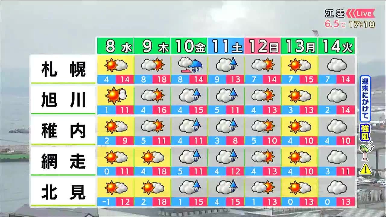木曜も海岸部で風がやや強いですが、日が差して、札幌は今年一番の18度まで気温が上がります。金曜から土曜は低気圧の影響で雨や風が強まるでしょう。