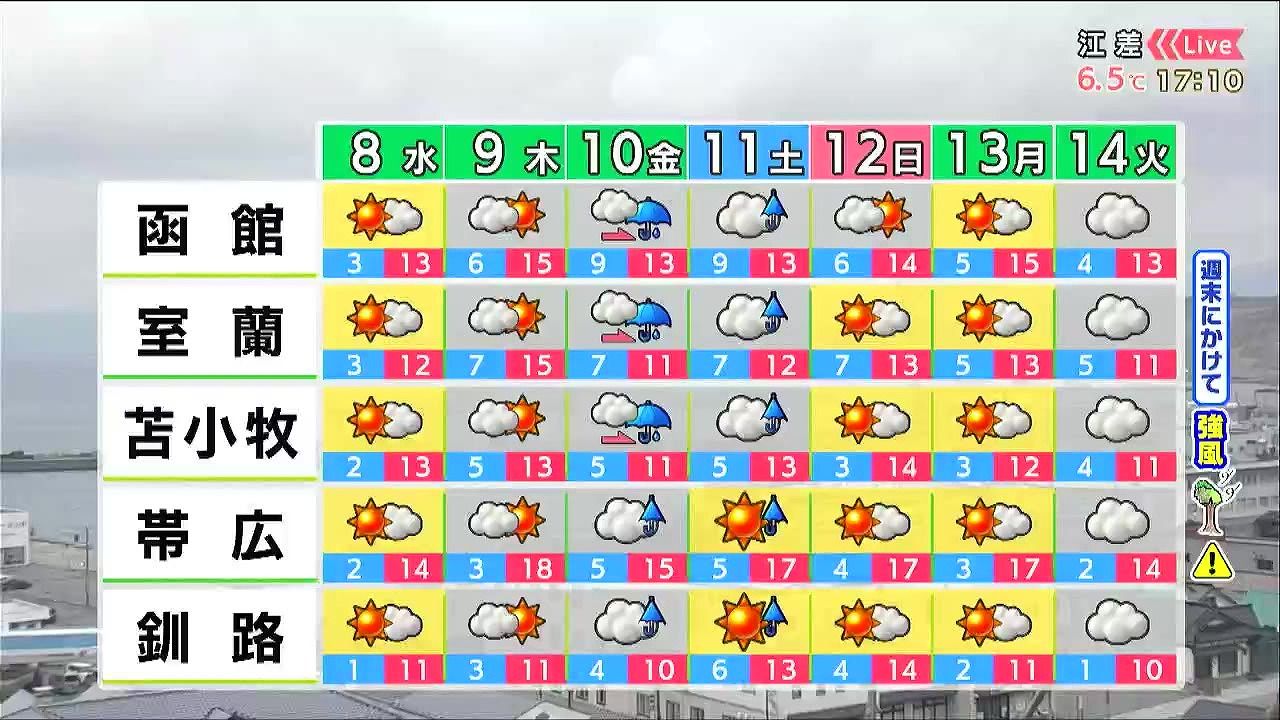 ※7日午後5時時点の情報です。最新の気象情報は、HBCウェザーセンターのホームページなどでご確認ください。HBCは気象庁の認可を2001年に得て以来、民間気象会社の一つとして「HBCの独自予報」を発信しています。