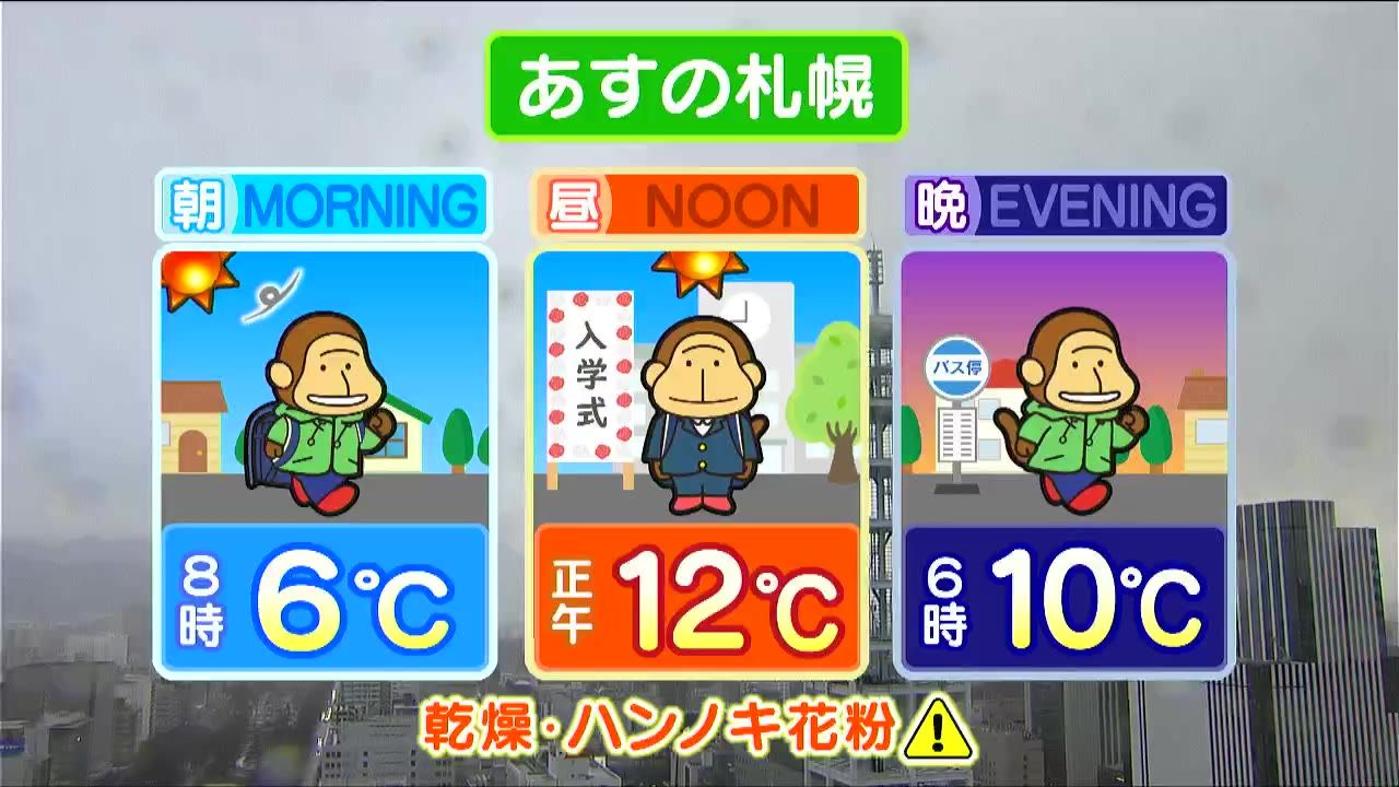 あすは天気が回復し、晴れて青空バックに記念撮影ができそうです。札幌では多少風が出る程度で、日差しの温もりを感じますが、空気の乾燥やハンノキ花粉に気を付けて下さい。