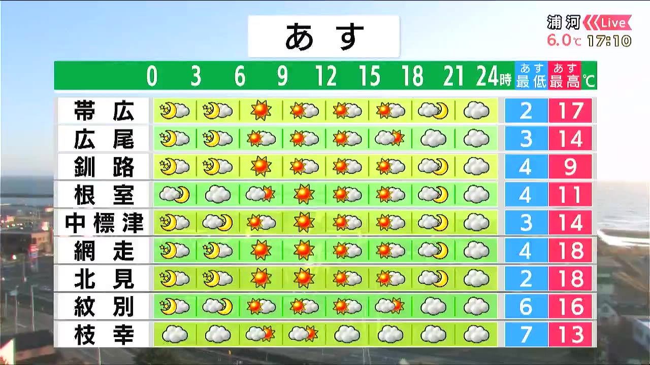 広く晴れて空気が乾燥します。風が強まるため、火の取り扱いにも注意して下さい。最高気温は帯広で17度、網走と北見は18度、女満別空港では20度近くまで上がるでしょう。