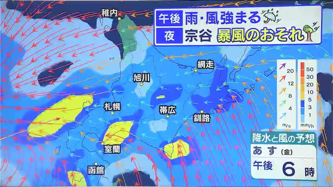 あす10日(金)午後は全道的に雨が降り、傘にバチバチと音を立てるほど降り方が強まり、太平洋側などでは南風も強まります。夜は宗谷地方で再び、警報級の暴風となるおそれがあります。