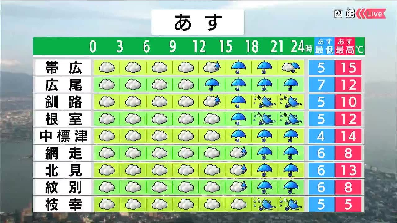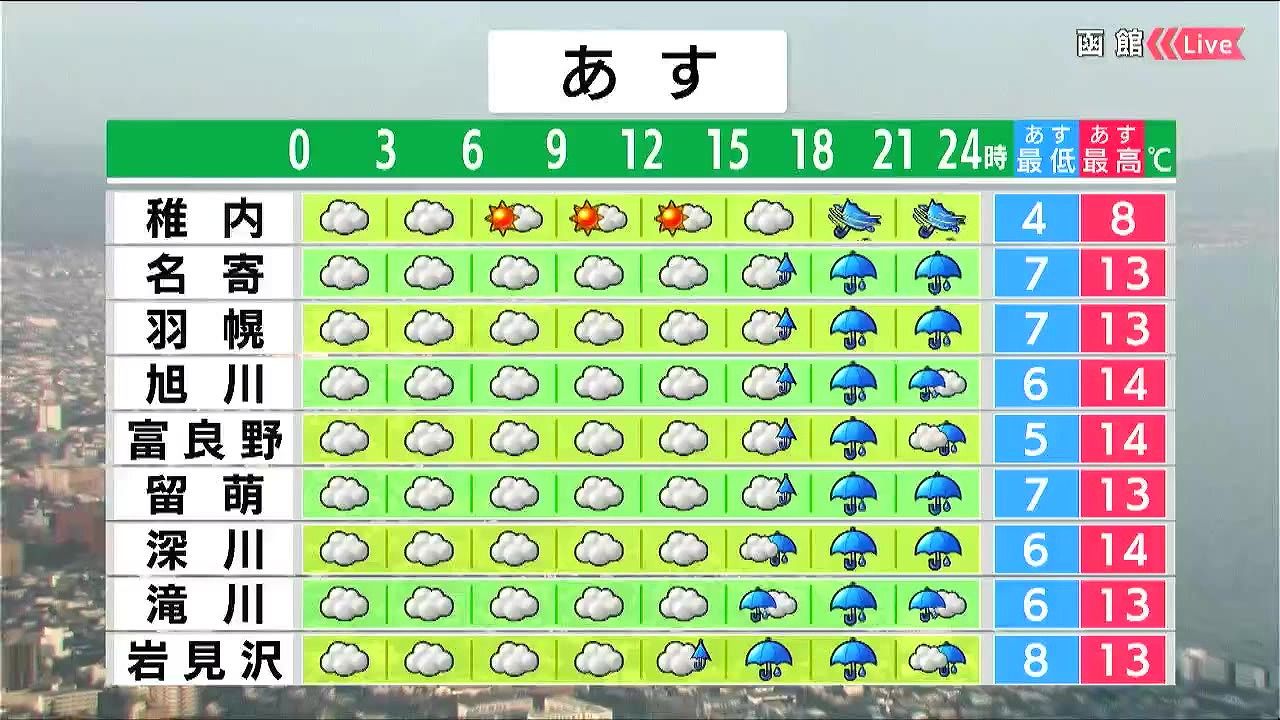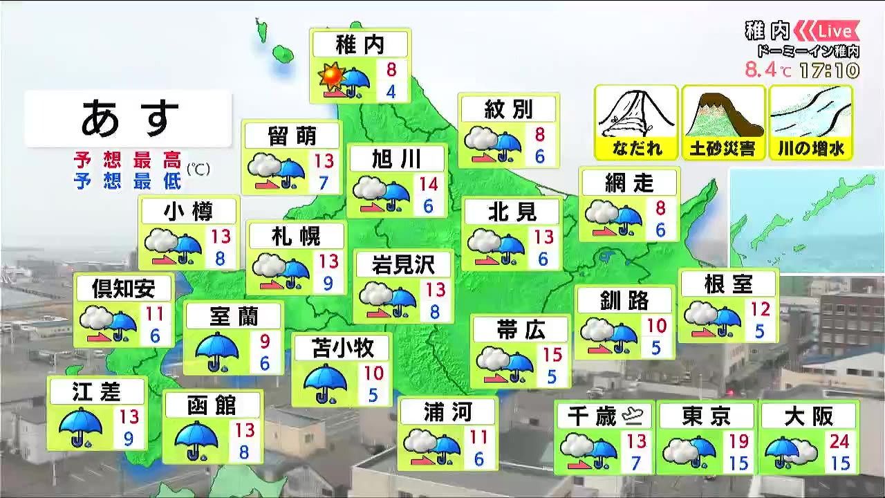 午後を中心に雨や風が強まるでしょう。最低気温は6度前後で、札幌は9度です。最高気温はきょう9日(木)ほどではないものの、平年より高い状態が続きます。なだれや土砂災害、河川の増水にも注意して下さい。