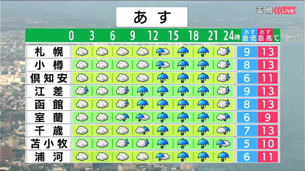 渡島半島や胆振地方は朝から雨、札幌周辺は昼頃から雨が降るでしょう。お帰りの時間帯が雨や風のピークとなるため、防水加工の靴や上着が必要です。