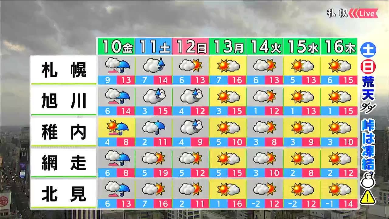 ※9日午後5時時点の情報です。最新の気象情報は、HBCウェザーセンターのホームページなどでご確認ください。HBCは気象庁の認可を2001年に得て以来、民間気象会社の一つとして「HBCの独自予報」を発信しています。