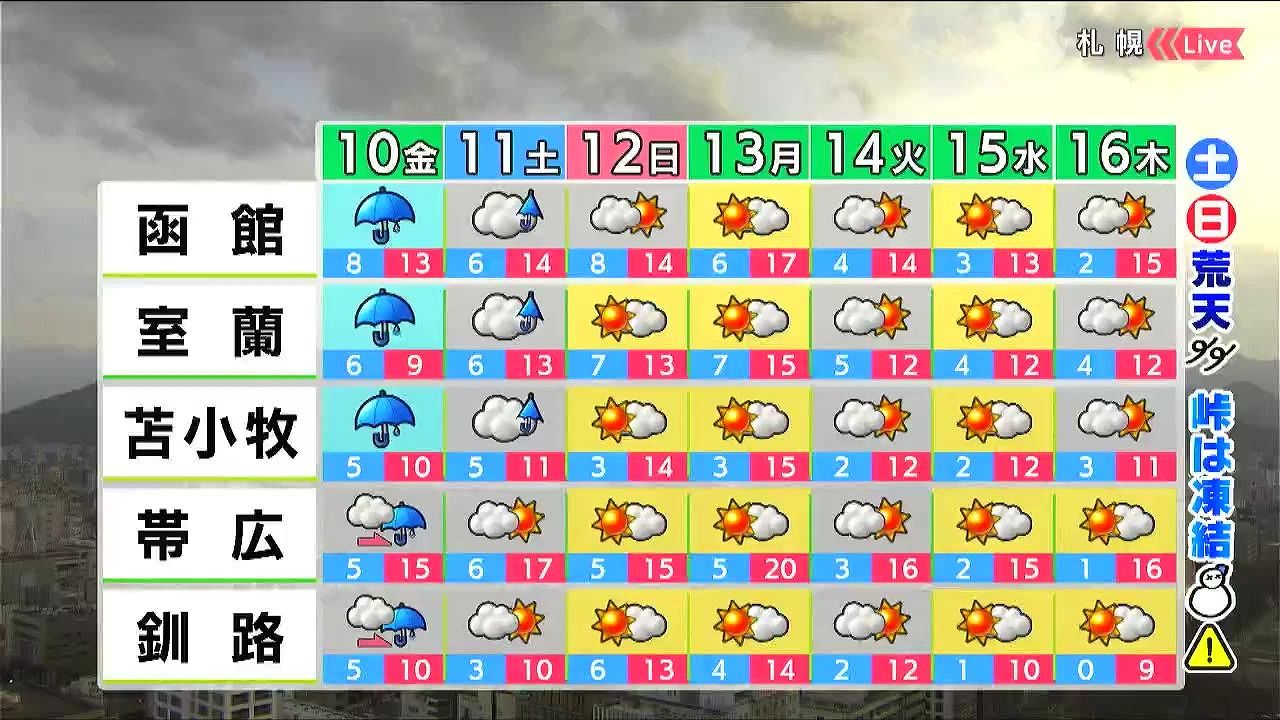 土曜は道南方面で雨が降り、大気の状態が不安定になるため、落雷にも注意が必要です。日曜は晴れますが、土日とも風の強い状態が続くでしょう。来週は穏やかな春の陽気になりそうです。
