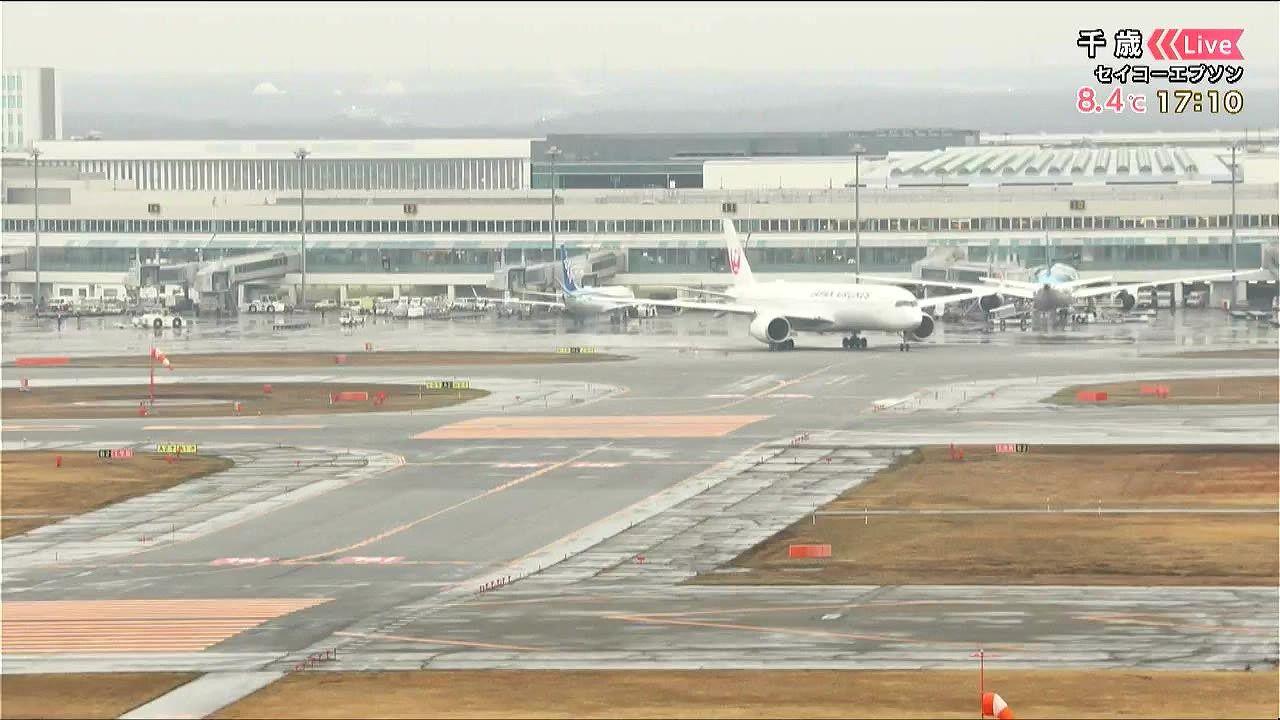 新千歳空港は雨で滑走路が濡れています。