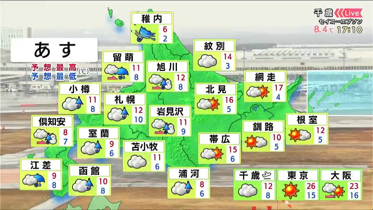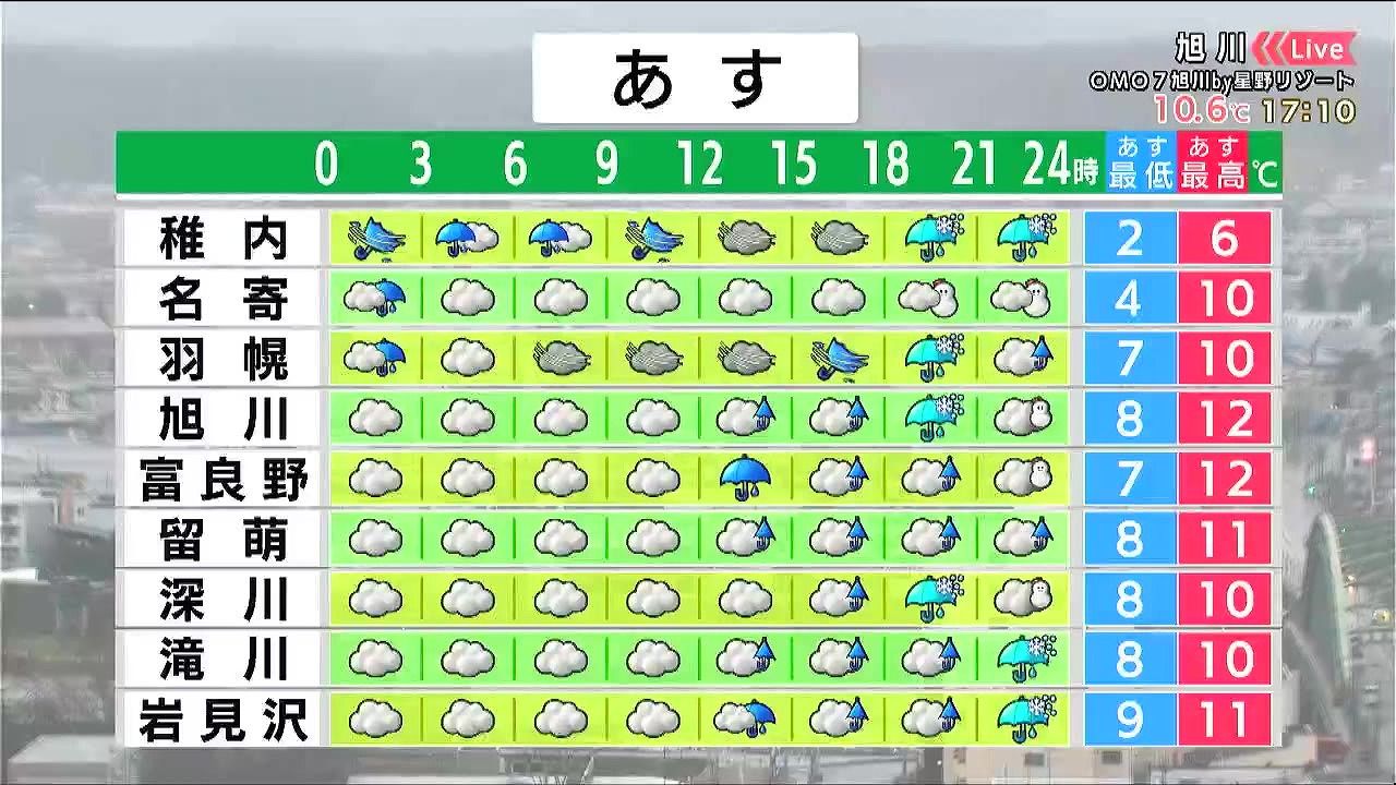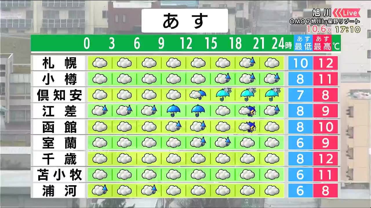 渡島半島は雨が降りやすく、夜は雷雨のおそれがあります。札幌周辺は午後に雨が降り、中山峠や倶知安は雪に変わるでしょう。
