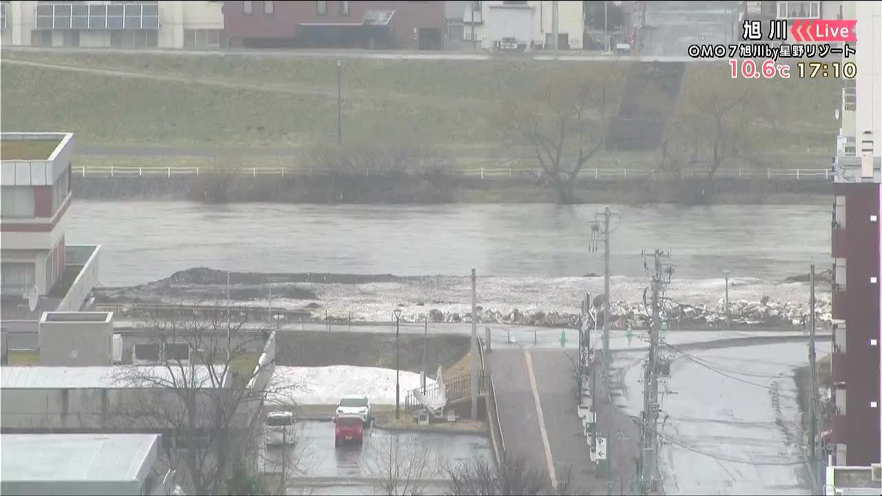 旭川を流れる石狩川は濁っています。雨や雪どけが加わり、川がさらに増水するおそれがあるので、川に近づかないで下さい。