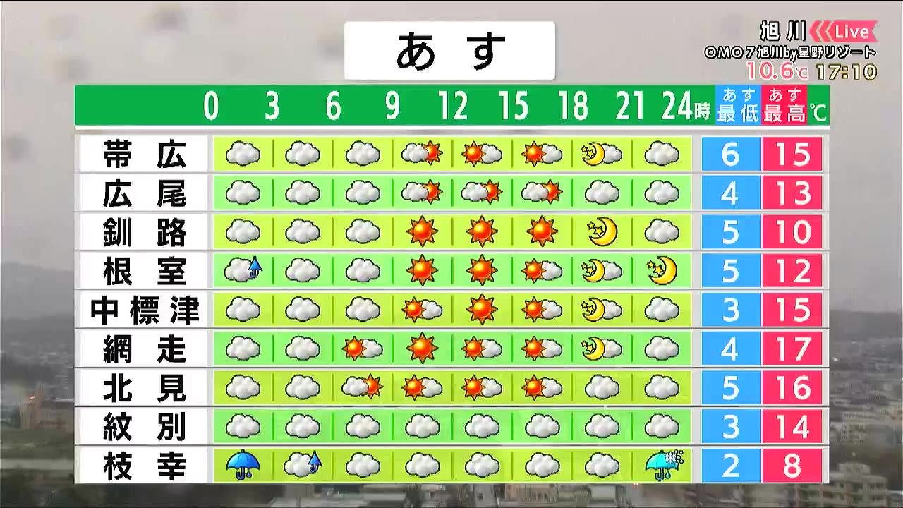 広く晴れて気温が上がりますが、あす11日(土)も風がやや強いでしょう。服装選びに気を付けて下さい。紋別は曇り空、枝幸は朝晩に雨や雪が降りそうです。