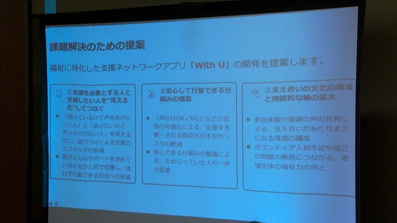 「本日は、福祉分野に特化した支援ネットワークアプリ『ウィズユー』の提案をしたいと思います」とプレゼンをする和田さん。