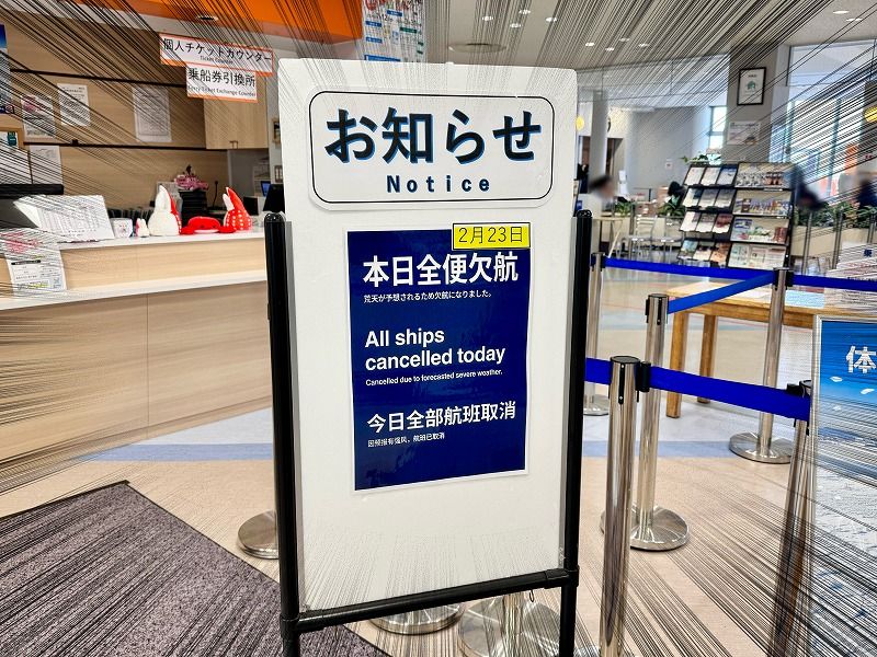 注)ストーリーの演出上、乗り場で突然欠航を知ったかのように書いていますが、人気のクルーズゆえにWebで予約をしてから現地を訪れていますし、ちゃんと前日に欠航となる旨のお知らせがメールで届いています。