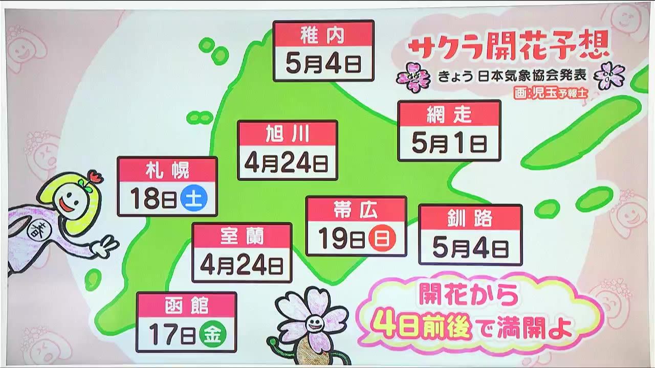 サクラちゃんが「開花から4日くらいで満開よ」と言ってます。函館、札幌、帯広では来週中ごろから後半が見ごろになりそうです。