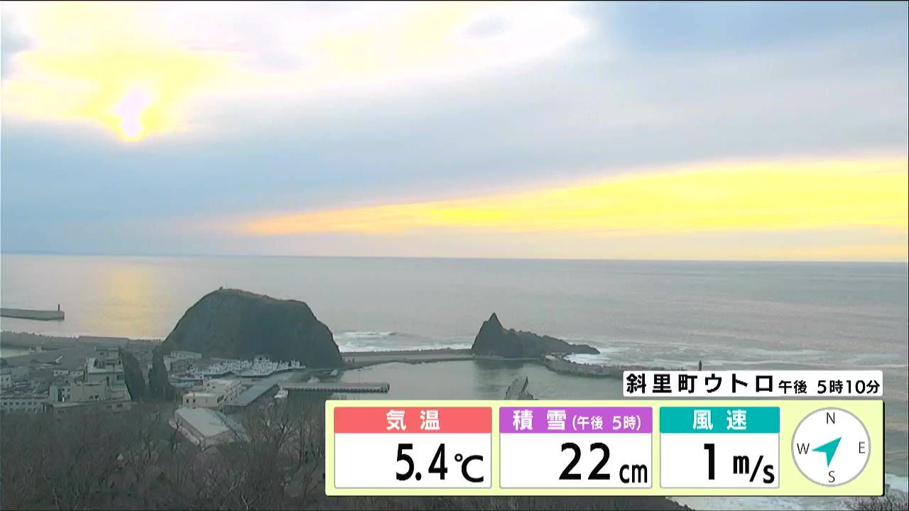 斜里町ウトロです。穏やかそうですが、積雪は22センチあります。