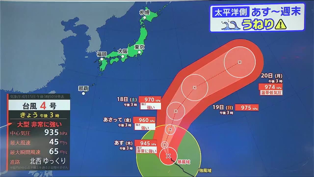 きょう15日(水)午後3時現在、大型で非常に強い勢力の台風4号が南海上にあり、北上中です。今後も北上を続けますが、19日日曜には進路を東に変え、日本から離れていきます。北海道に近づくことはなくても、太平洋側の海では台風からの「うねり」が入ります。あす16日(木)から週末にかけて数日間、注意して下さい。「うねり」が入ると、海が穏やかそうに見えても海岸付近で急激に波が高くなり、波にさらわれる事故も多くなります。最新の気象情報もご確認ください。