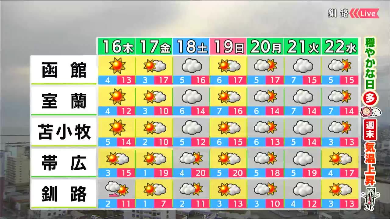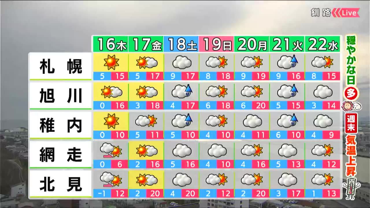 金曜も晴れるでしょう。土曜は道南で雨の降る可能性が低くなりました。土日は函館などお花見にもまずまず、帯広は土日とも20度まで気温が上がってサクラが開花しそうです。