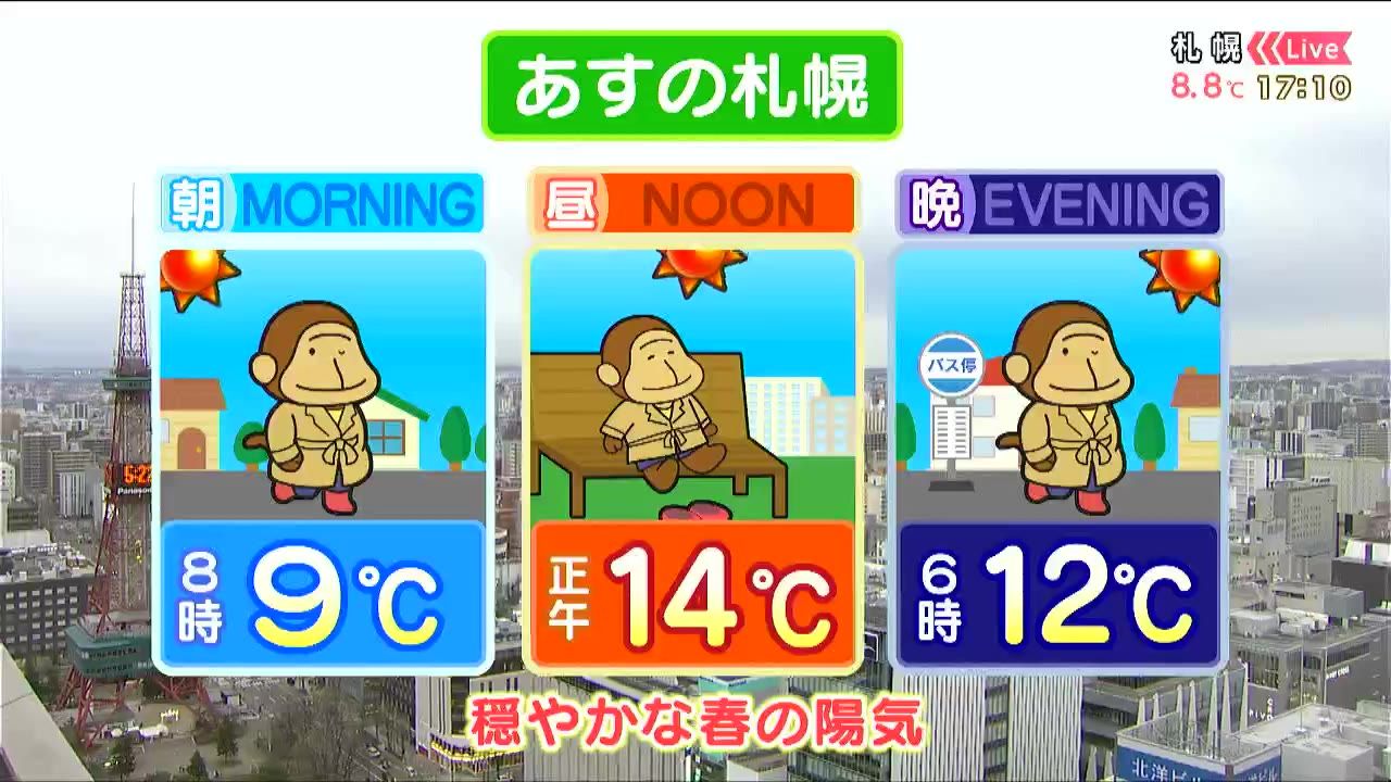 あす16日(木)の札幌です!朝昼晩の天気をもんすけでお伝えします!