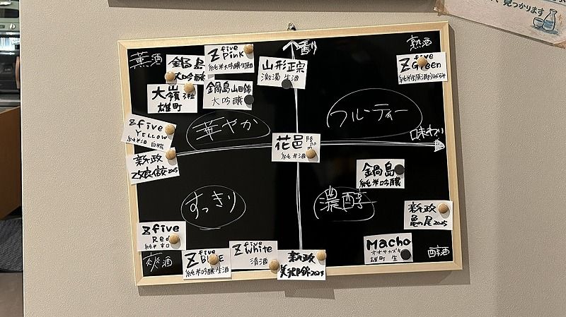 日本酒は分類図が貼ってあって、初心者でもオーダーしやすいのがポイント。