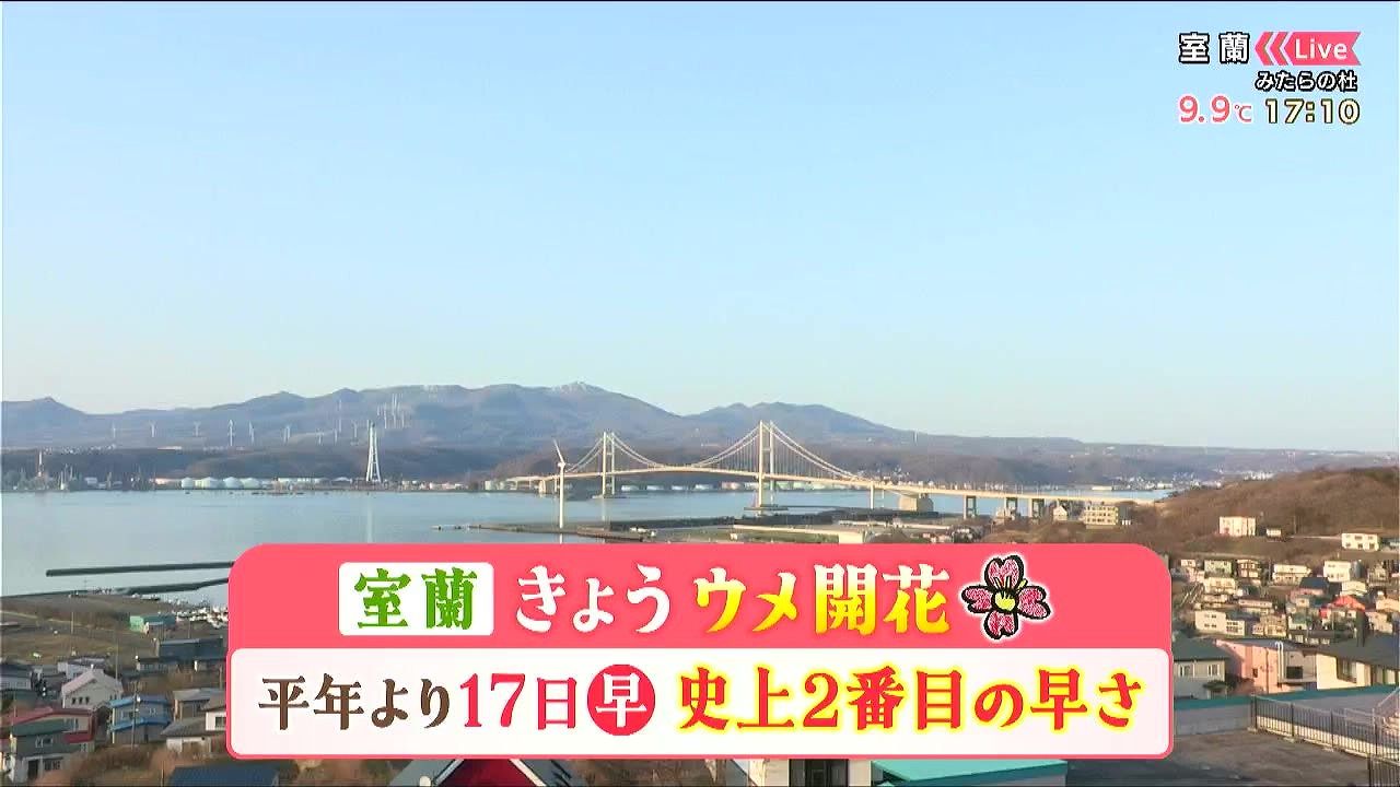 春の陽気で、室蘭ではきょう16日(木)、ウメが開花しました。平年より17日も早く、史上2番目の早さでの開花となりました。来週後半にはサクラも開花しそうです。