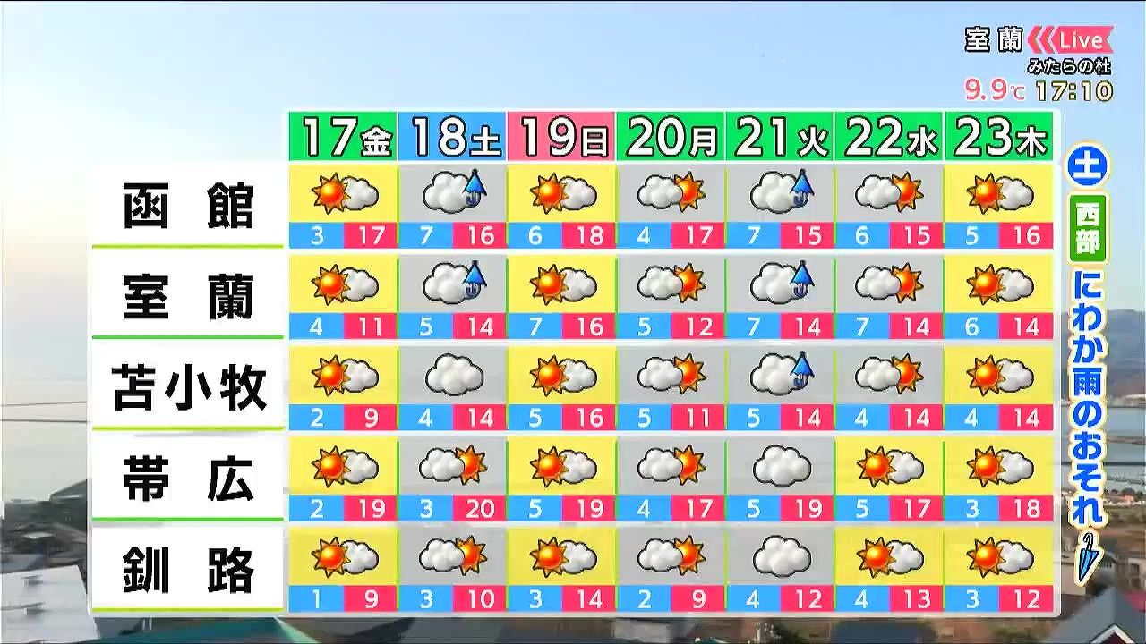 ※16日午後5時時点の情報です。最新の気象情報は、HBCウェザーセンターのホームページなどでご確認ください。HBCは気象庁の認可を2001年に得て以来、民間気象会社の一つとして「HBCの独自予報」を発信しています。