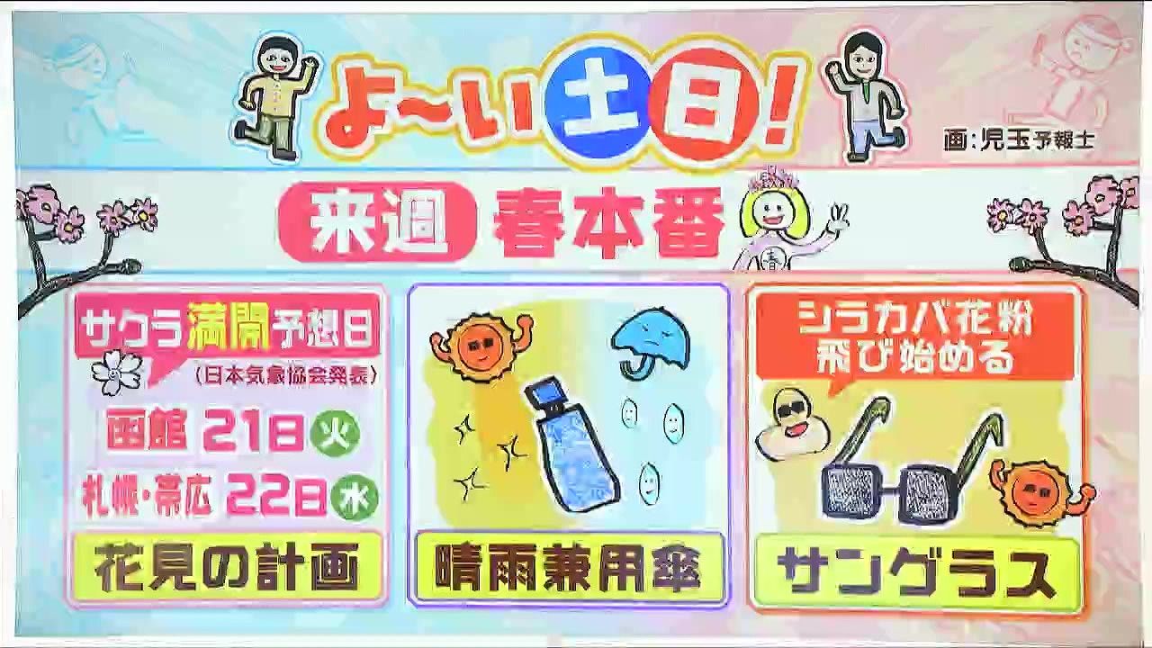 函館は来週火曜日、札幌や帯広は水曜日なので、「花見の計画」は早めに立てましょう。この時期、紫外線が強まってきています。また短い周期で天気も変わるため、「晴れ雨兼用の傘」を準備しましょう。