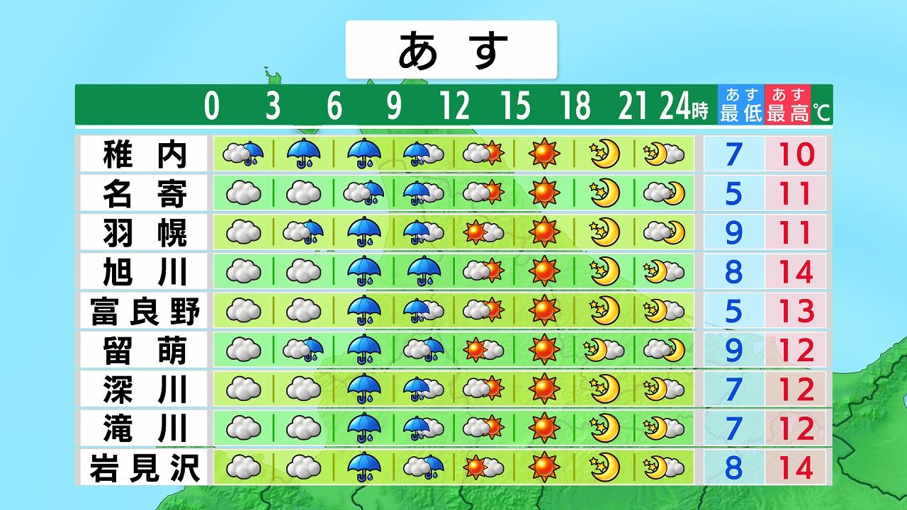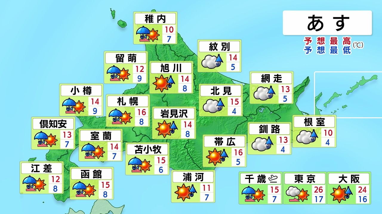 午前は雨で傘がさしにくくなるような風を伴います。午後は晴れますが、風のやや強い状態が続き、黄砂で空は霞むでしょう。最高気温は旭川や留萌など道北できょう20日(月)より5度以上低くなりそうです。