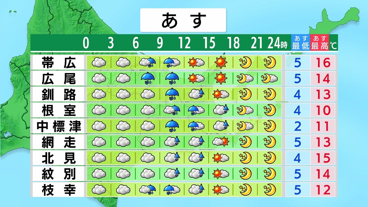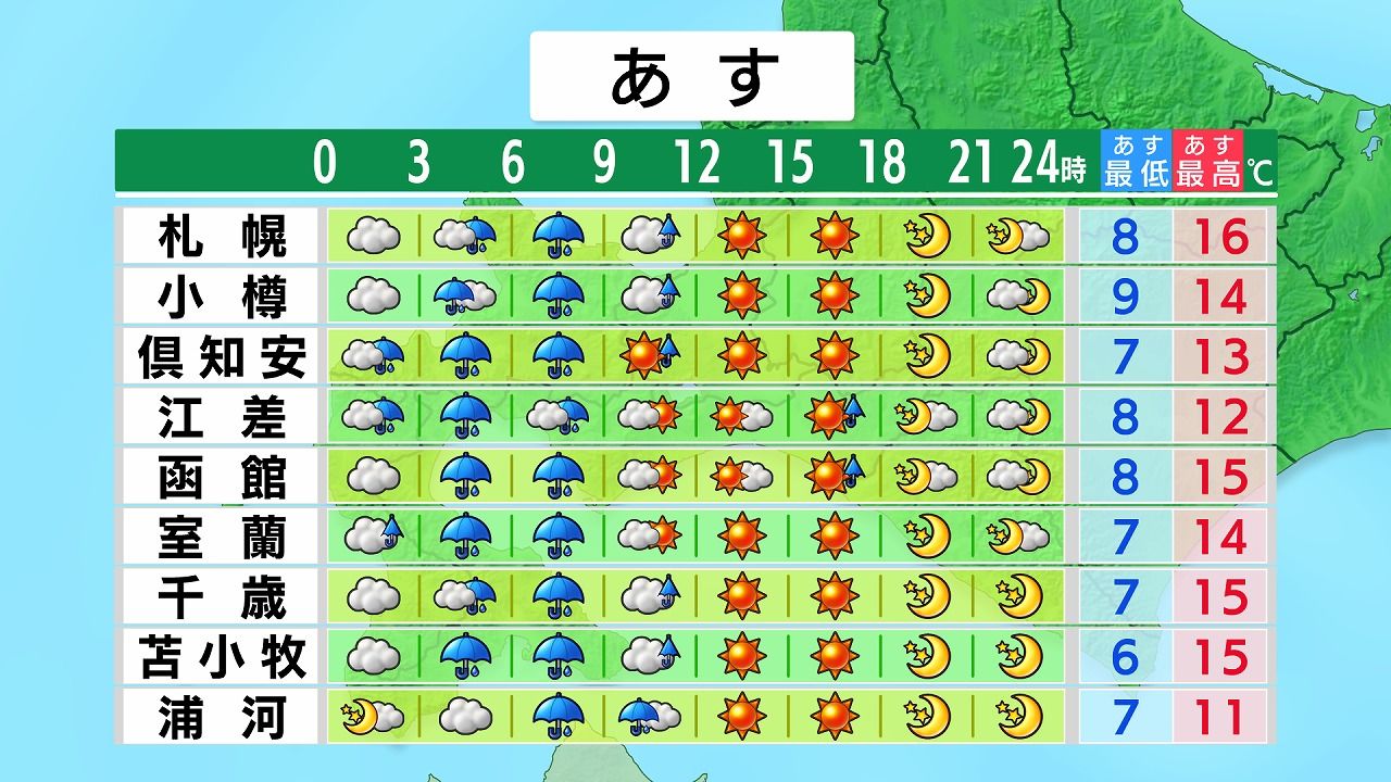 あす21日(火)の時間ごとの天気。道央・道南からです。