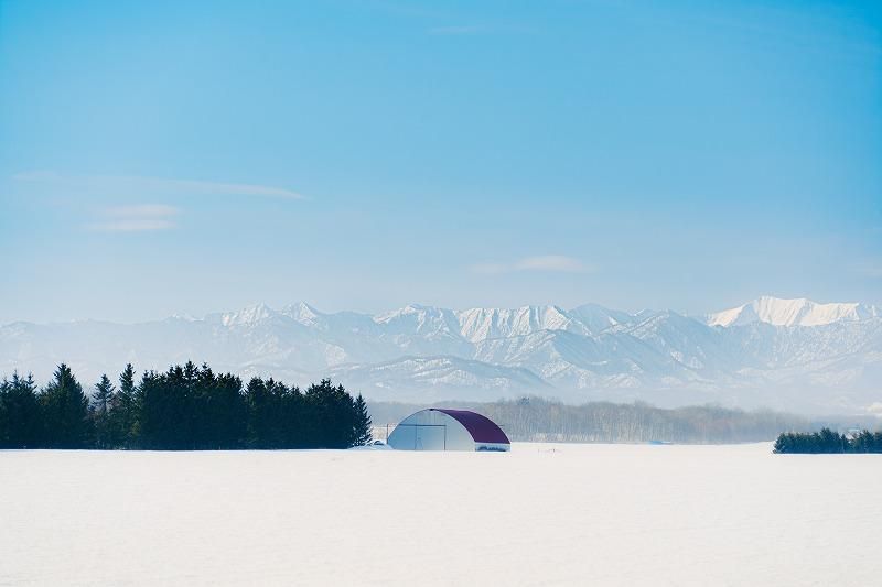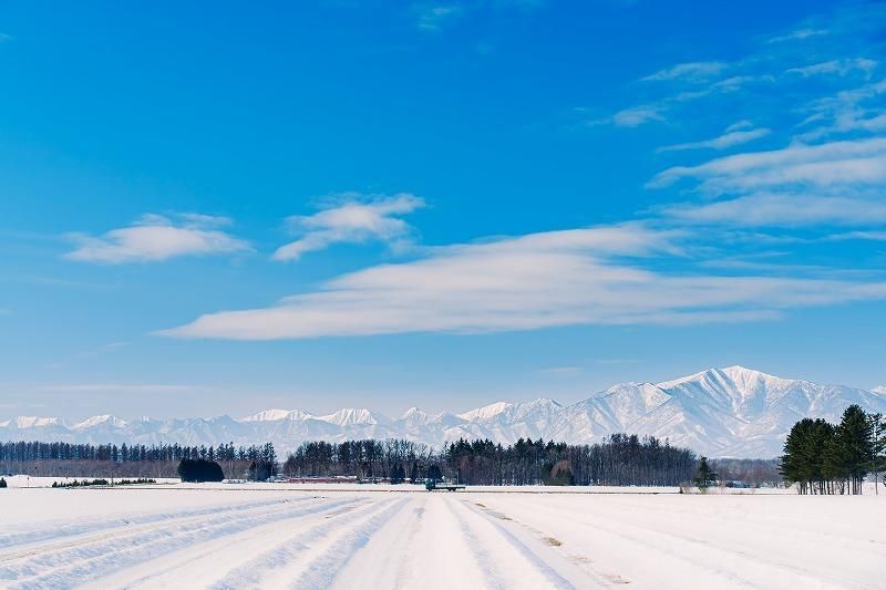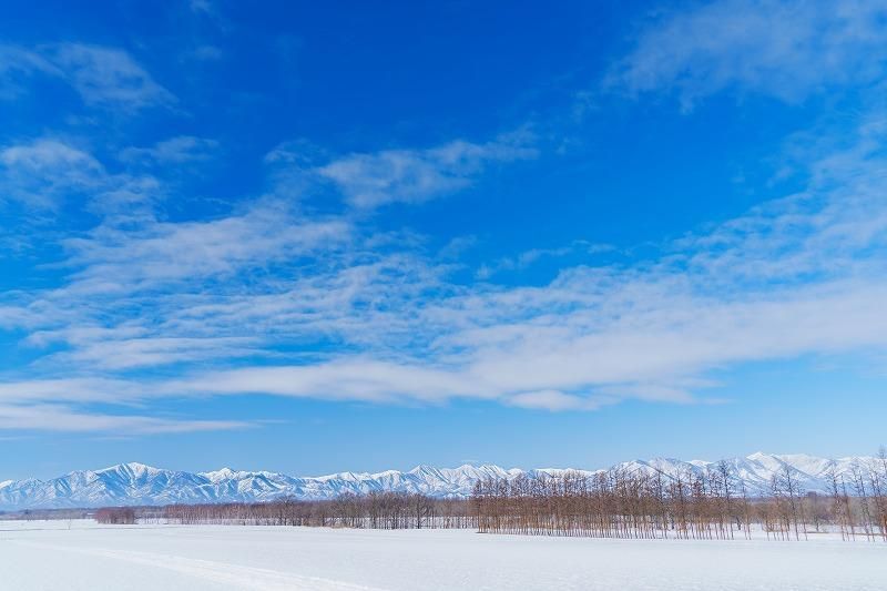 残雪が残る日高山脈と空の青色がとてもきれい。コントラスト豊かな景色を作ってくれます。
