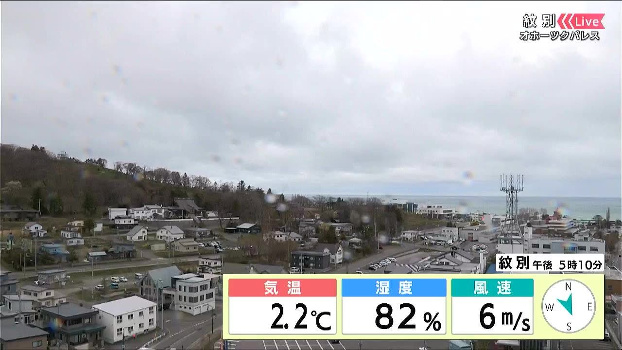 紋別は曇り空でレンズに雨粒がついています。