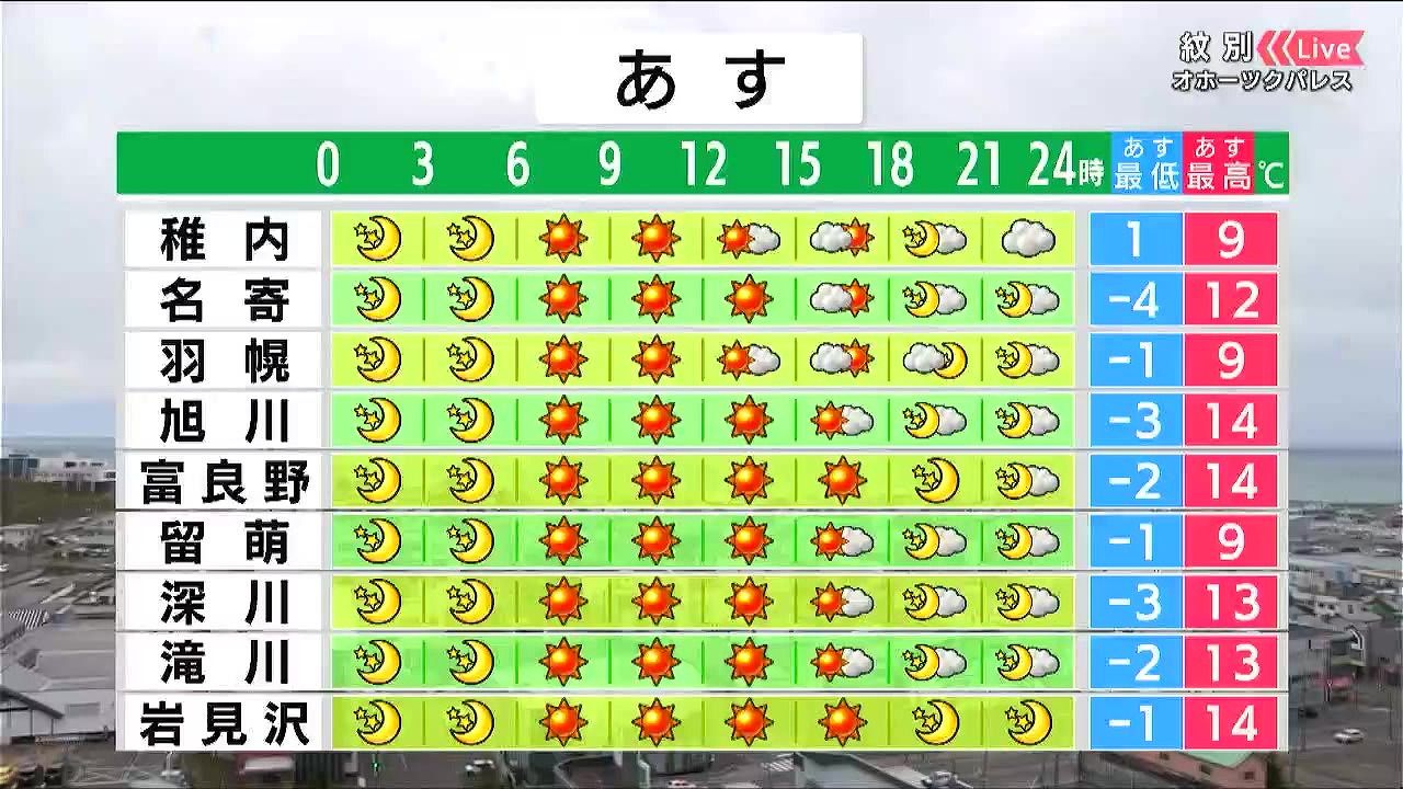 午前を中心に穏やかに晴れるでしょう。ただ朝は冷えて、旭川は‐3度です。日中の寒さは緩みますが、重ね着など調節しやすい服装がオススメです。