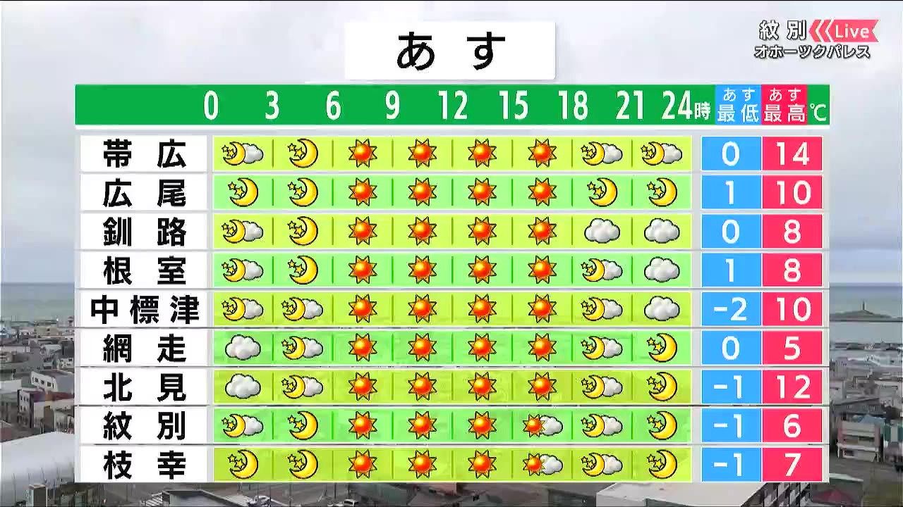 日中は晴れて、空気が乾燥するでしょう。海岸部は最高気温でも1ケタの寒さが続きます。網走は5度で冬用の上着が必要です。