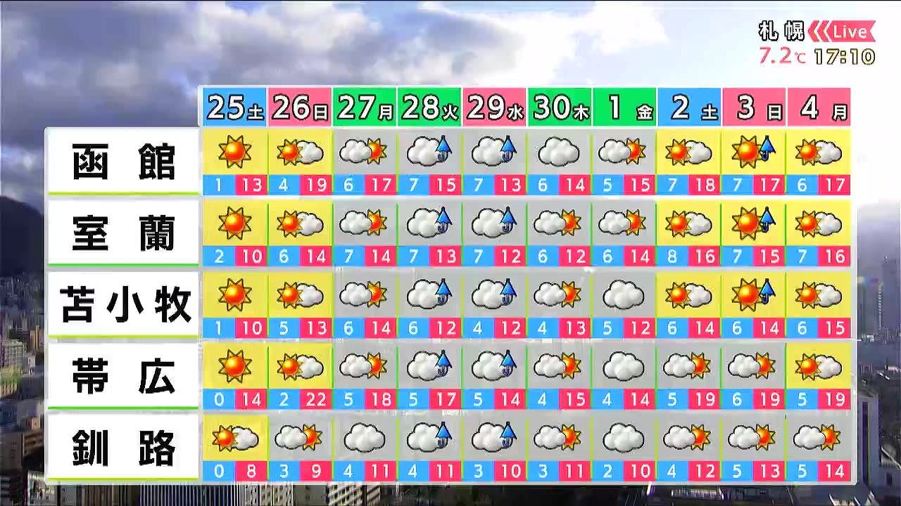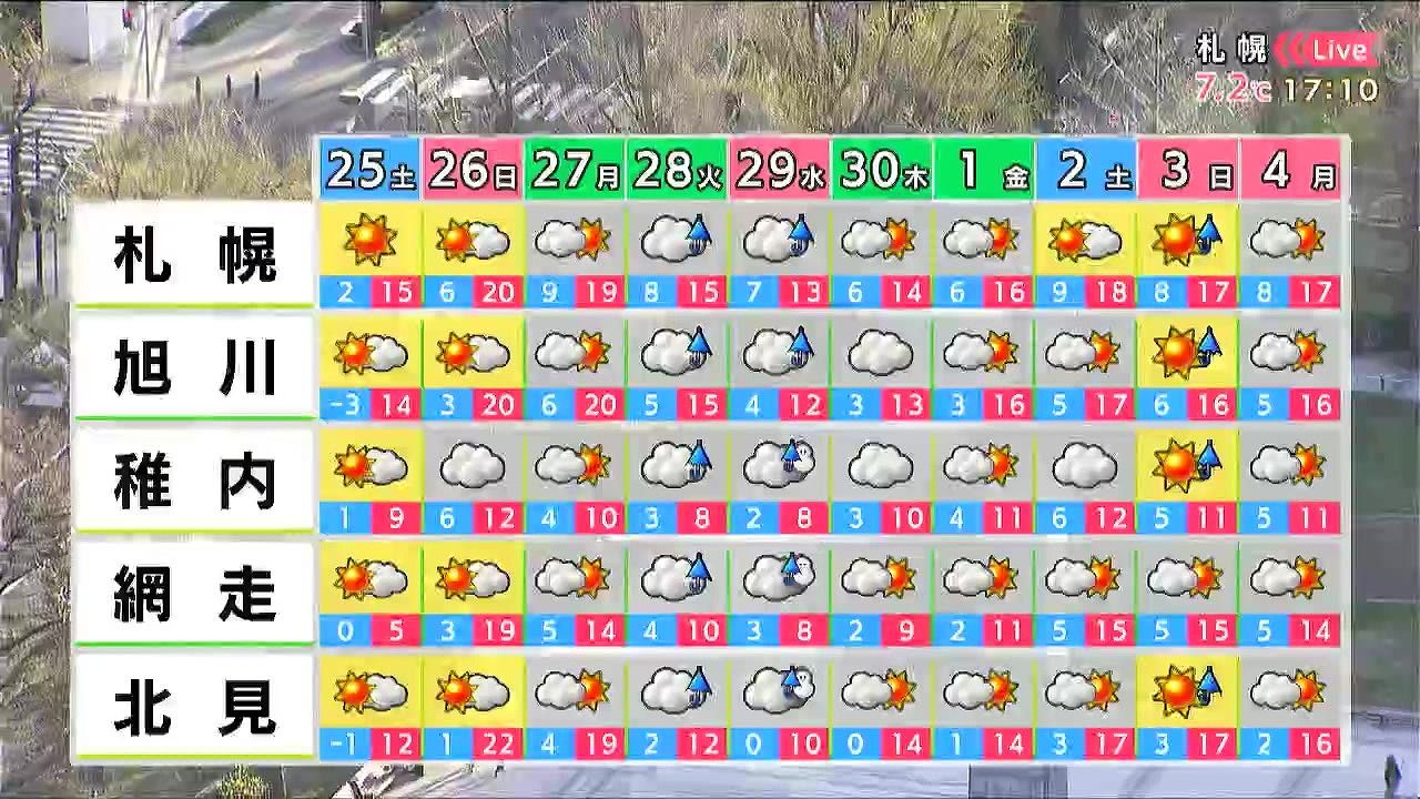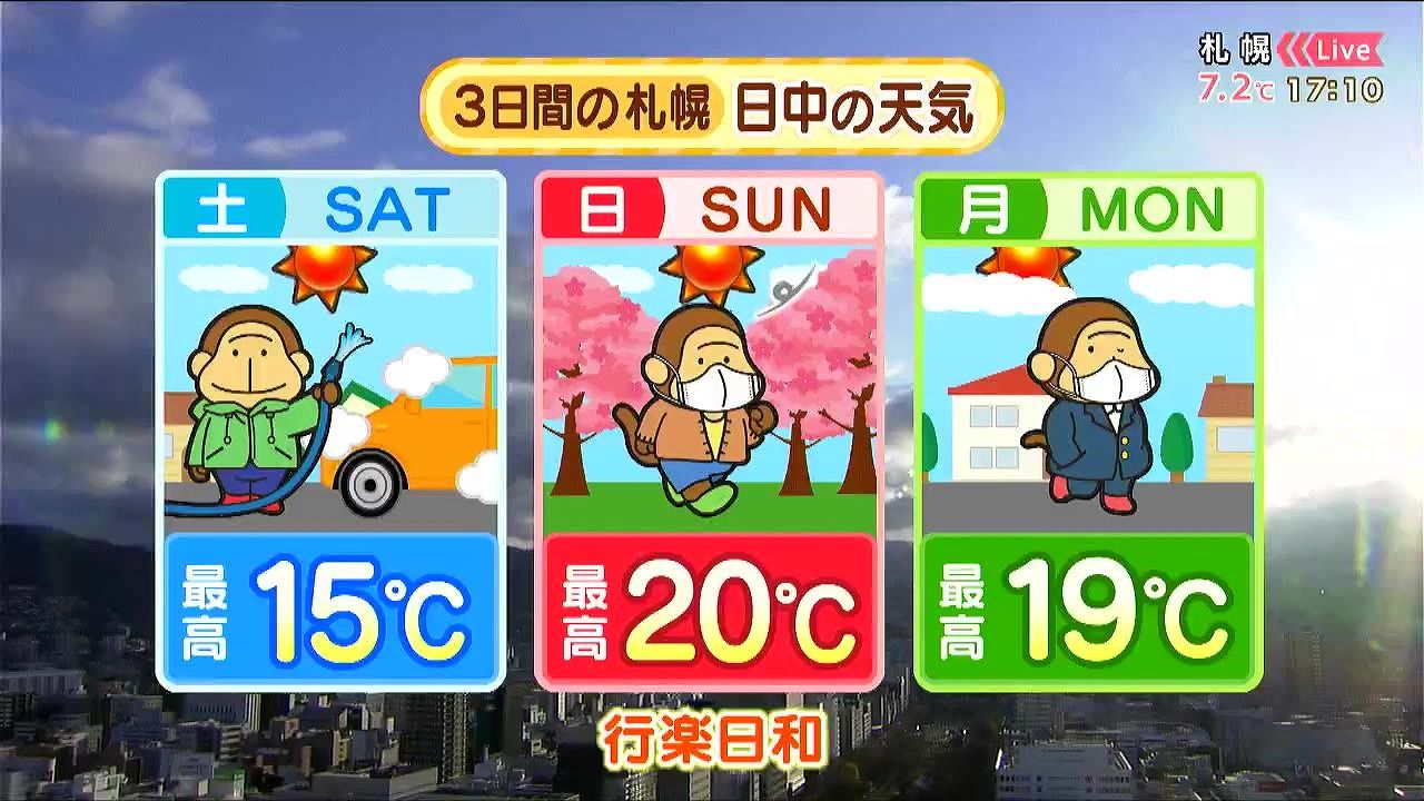 日曜も晴れて札幌や旭川は20度、北見は22度と汗ばむ陽気です。来週水曜は道北やオホーツク海側で再び雪がまじります。今年の連休は割合穏やかに経過しそうです。