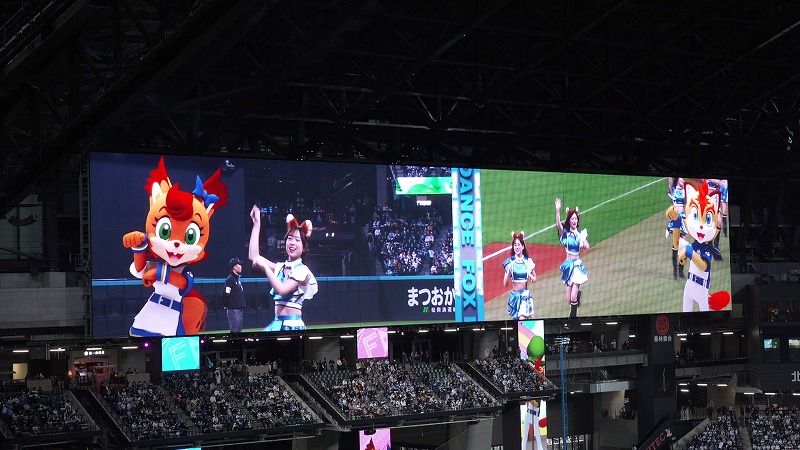 試合経過や選手の情報はもちろん、きつねダンスやYMCAなど、イニング間のイベントも映し出され、野球観戦をより楽しめるエンターテイメントです。