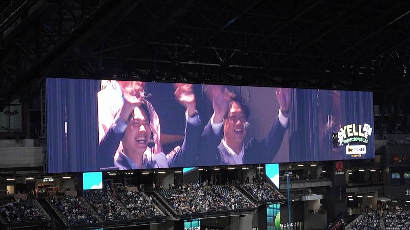 3回裏、西川遥輝選手の打席で、柴野さん夫妻がビジョンに登場!