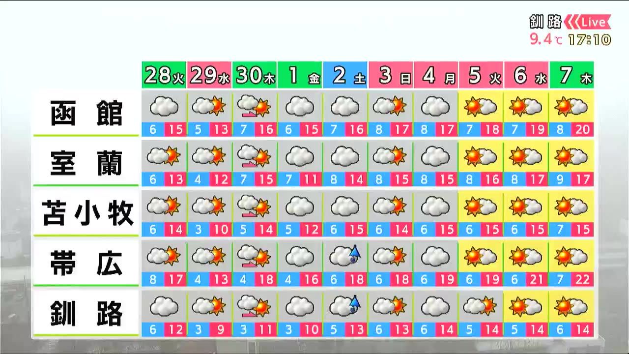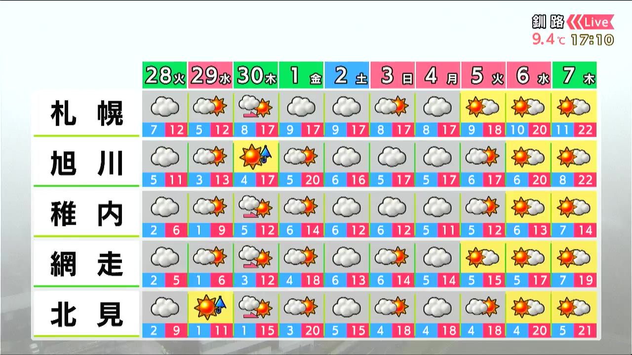 ※27日午後5時時点の情報です。最新の気象情報は、HBCウェザーセンターのホームページなどでご確認ください。HBCは気象庁の認可を2001年に得て以来、民間気象会社の一つとして「HBCの独自予報」を発信しています。