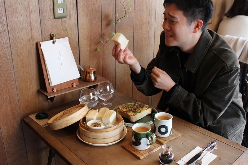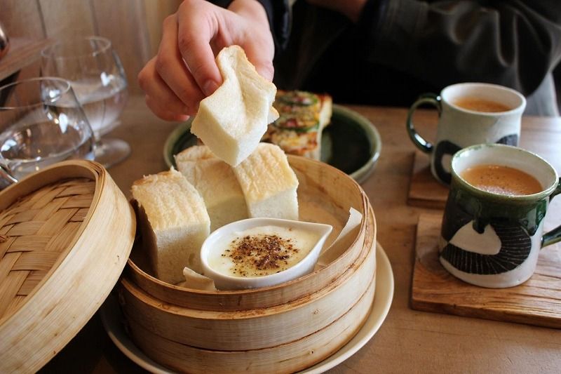 ふわふわのパンを温玉しょうゆに付けていただく新しいスタイル!