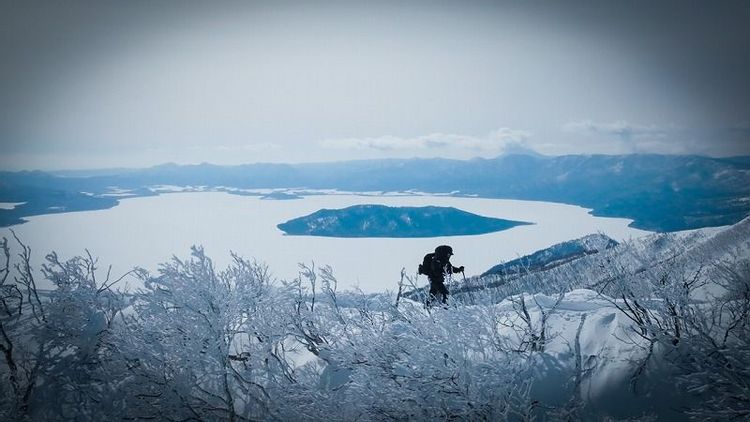 白一色に覆われた斜面を登ると、眼下には全面結氷した屈斜路湖が広がり、その外輪山とともに世界有数のカルデラのスケールを実感できる風景が現れます。
