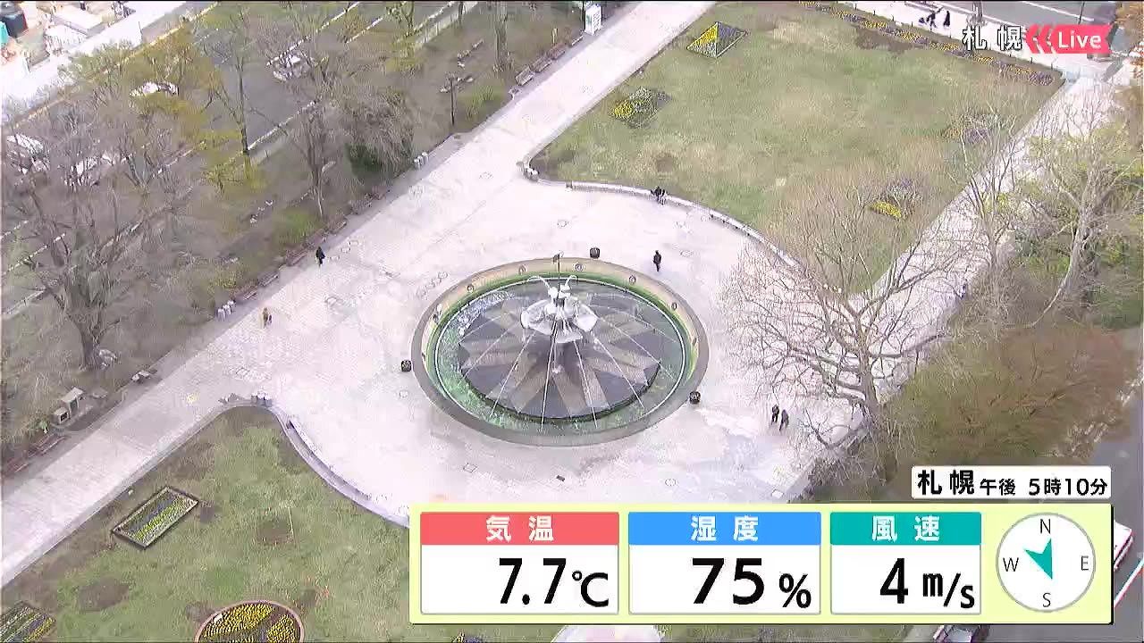 札幌大通公園です。HPによると、先週土曜日に2、3、4丁目の噴水の水が出るようになりました。画像は4丁目の噴水です。あさって以降は、噴水のまわりにいても気持ちのいい気温になりそうです。