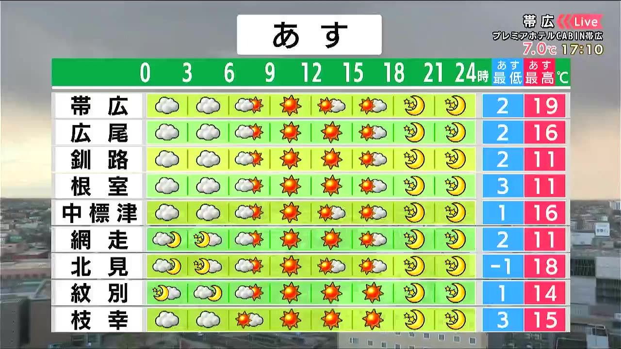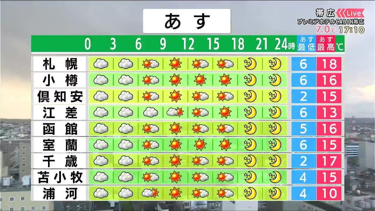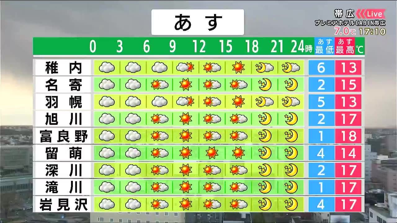 稚内や羽幌は朝晩を中心に低い雲が広がります。旭川や岩見沢などは朝から晴れて、気温は15度を超えるでしょう。朝と日中の気温差が大きくなります。