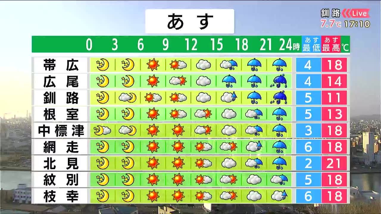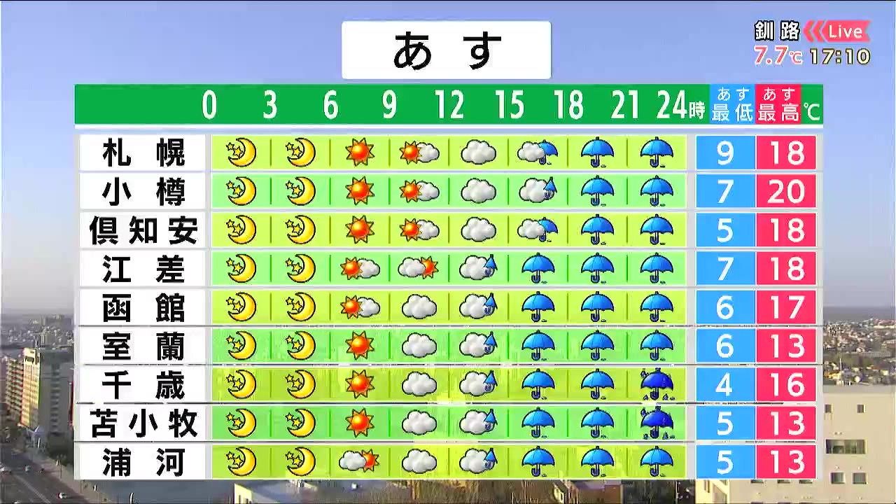 昼頃から道南方面で雨が降り出し、札幌も夕方から雨でしょう。夜は胆振や千歳周辺で雨が強まります。最高気温は札幌で18度など気温が上がりますが、風が強まるでしょう。