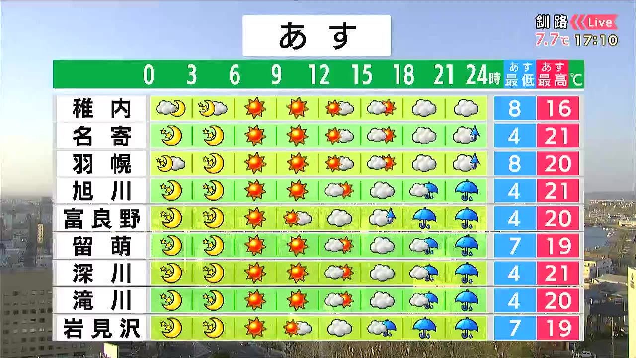 昼頃まで晴れますが、夜は広く雨が降るでしょう。暖かい南風が強まり、気温が上がります。名寄や旭川、深川の最高気温は21度で汗ばむくらいでしょう。